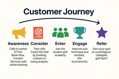 As an agile practitioner (with an Enneagram 1 wing, IYKYK), including testimonials of collegiate golfers is a way to "close the loop." The primary business goal of Coach Mo Golf Pro is to procure youth golfers who aspire to attain scholarships and collegiate golf careers. To demonstrate the connection, the customer journey tells this story: